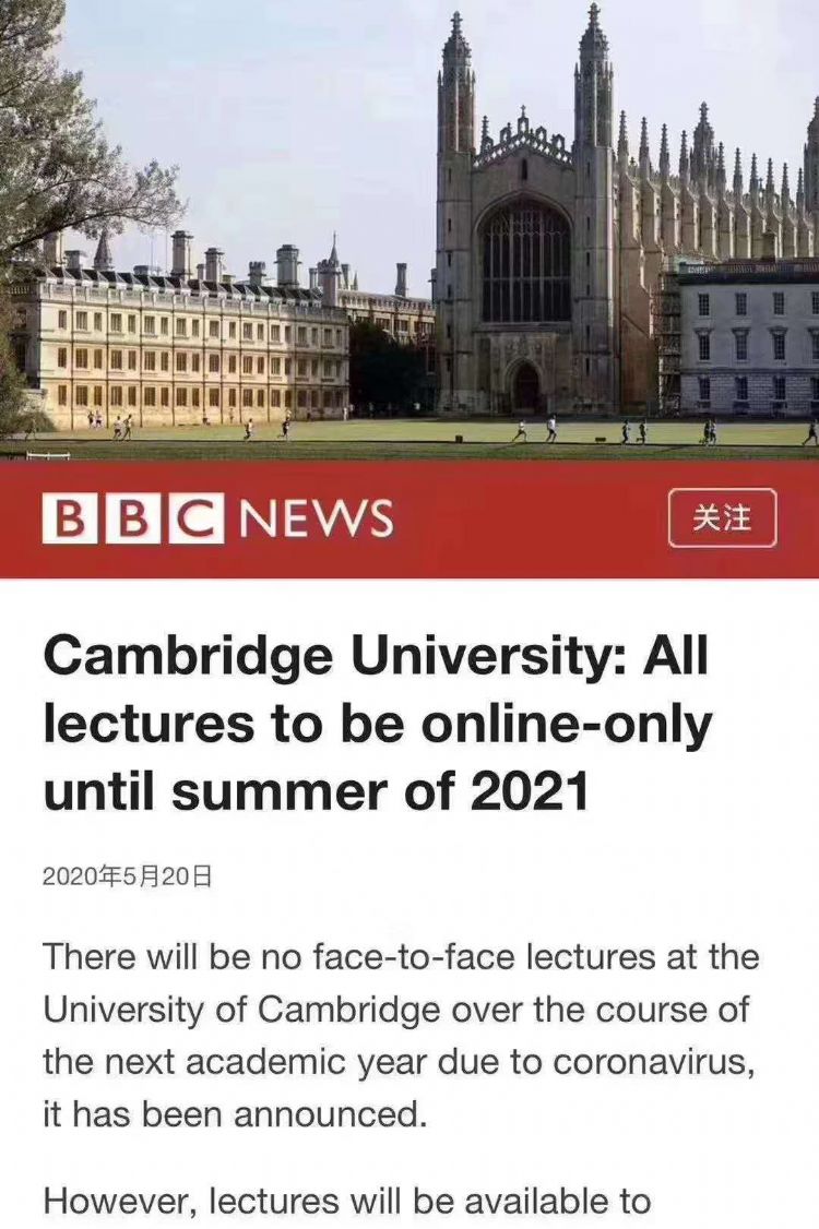 剑桥大学宣布,受新冠疫情影响,下一学年将不会进行面授课程。学生可以通过在线的形式上课,此外学校表示,在符合保持社交距离的防疫要求前提下,“或许也会组织小规模的授课组进行面授课程”。