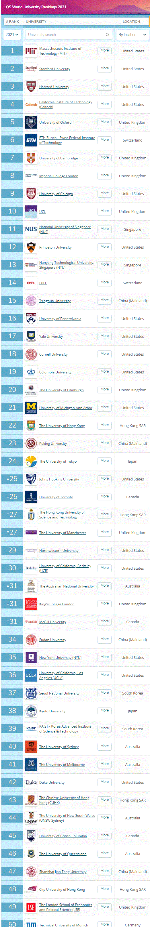 今年的QS世界大学排行榜的前四名被美国大学包揽!MIT、斯坦福大学、哈佛大学、加州理工大学分列前四名。整体来看,美国上榜大学数量减少了7所。