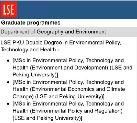 LSE新开硕士专业主要是,LSE与北京大学联合进行教学的双学位专业,隶属地理环境学院(Department of Geography and Environment)。